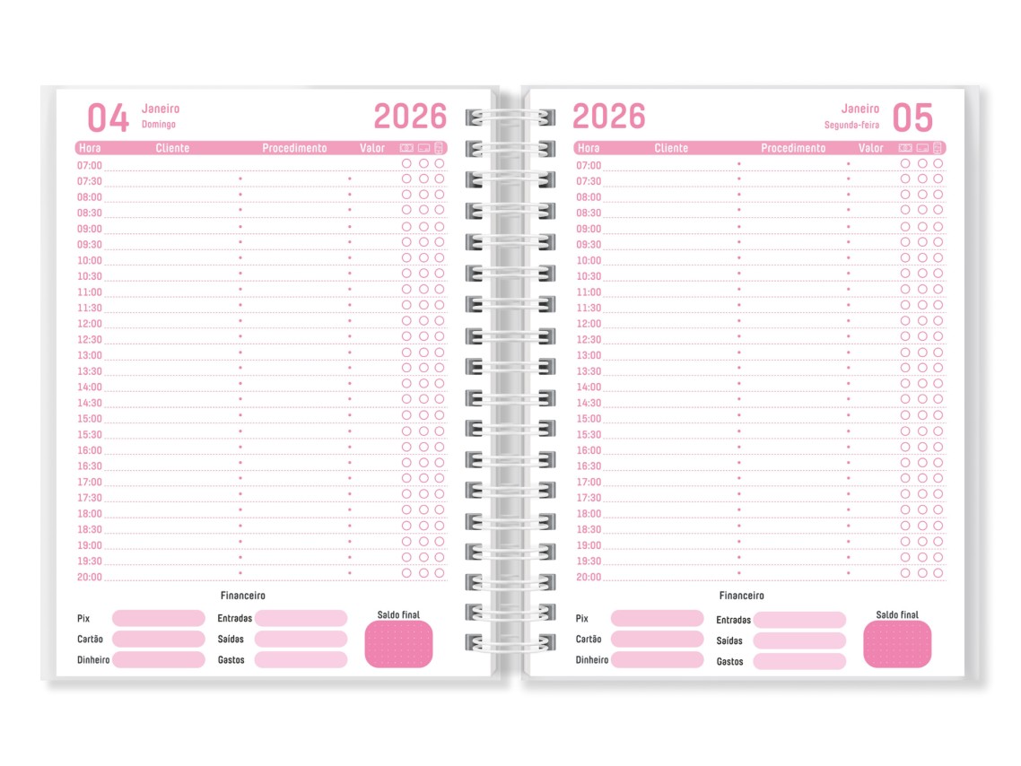 Agenda de agendamento totalmente personalizada com horários de 30 em 30 minutos e com 1 dia por página.
